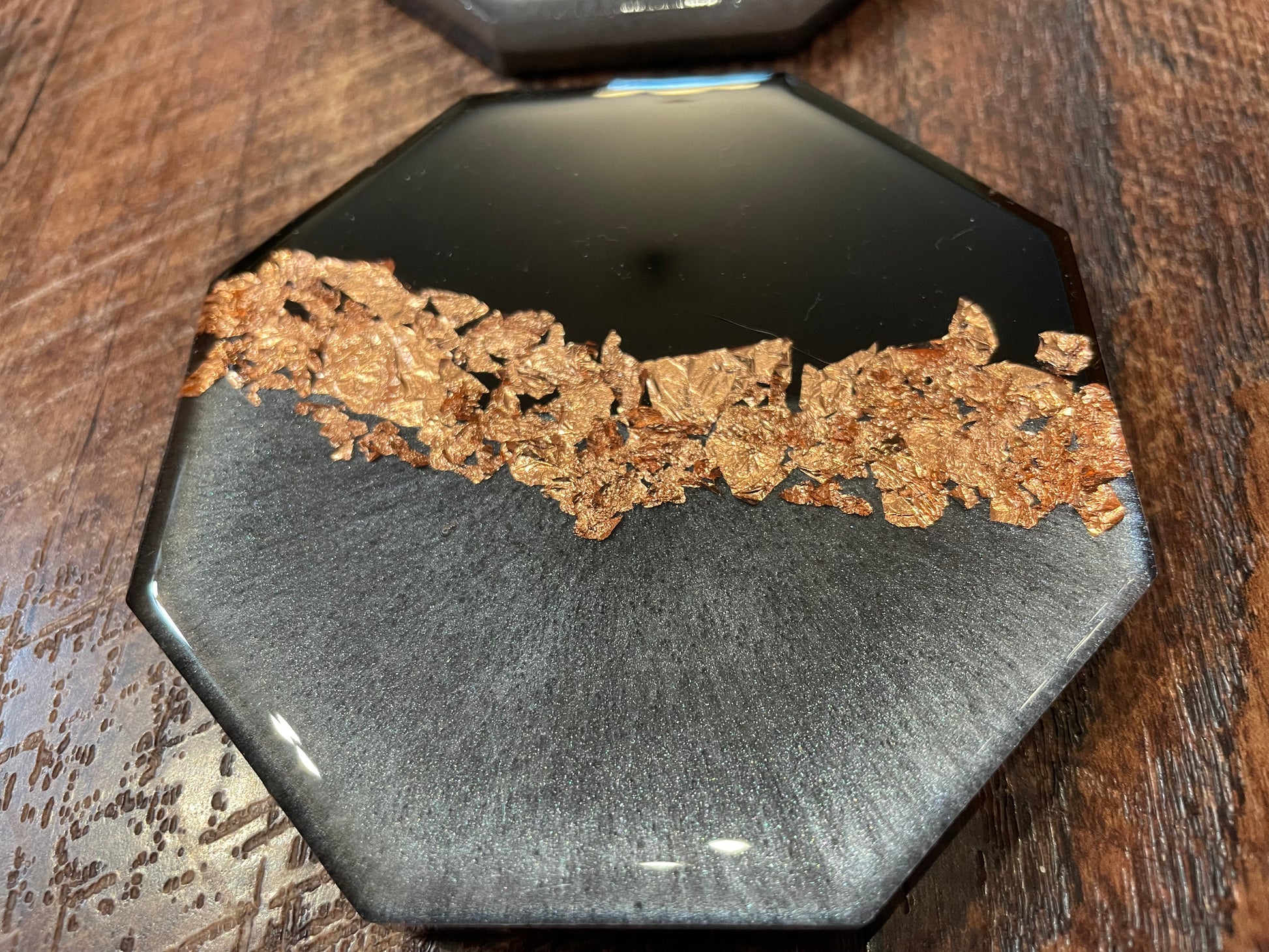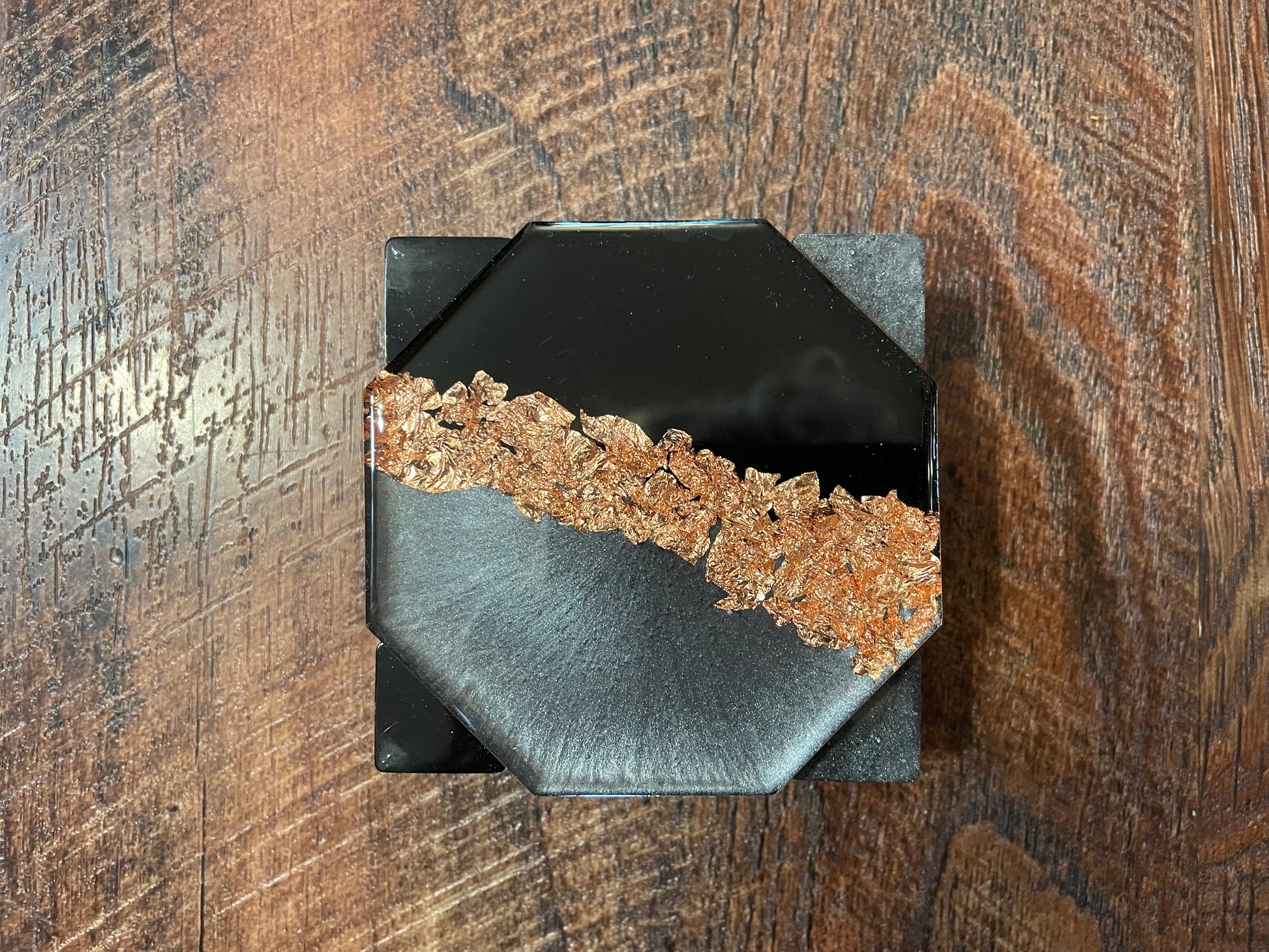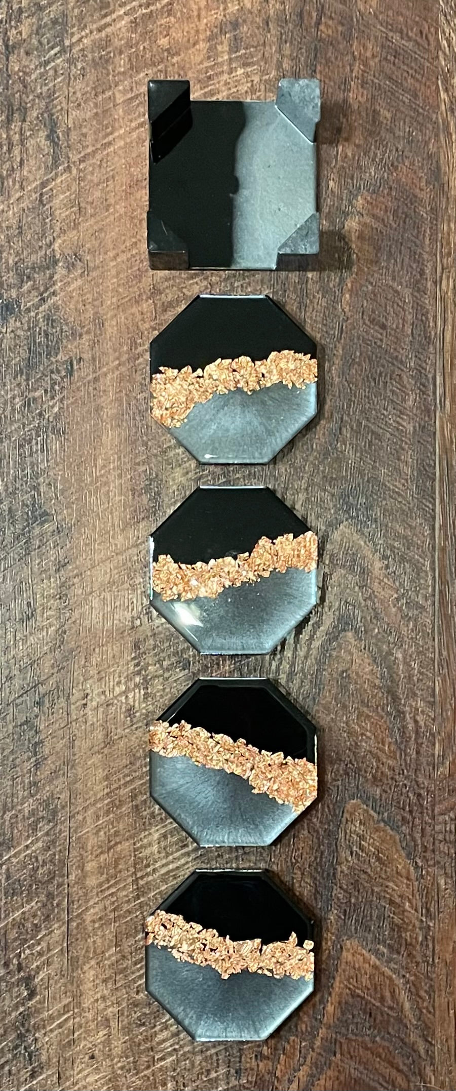 Resin 5 piece coaster set. Black and grey resin coasters with copper flakes. The undersides are adorned with cork to protect your surfaces.