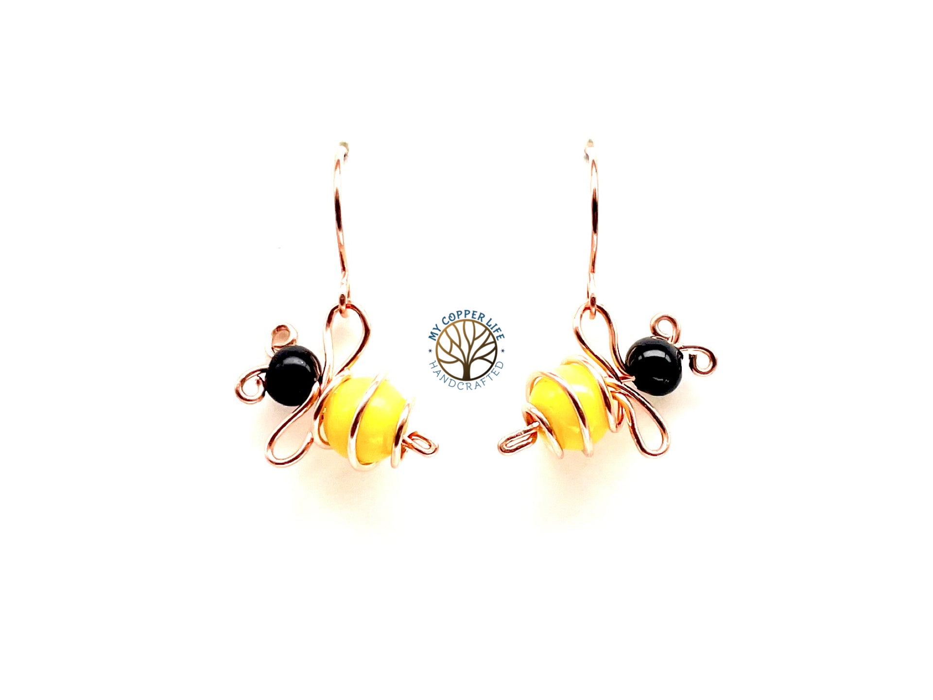 Copper wire and beaded honey bee earrings. Ear wires are also hand-crafted with copper wire.