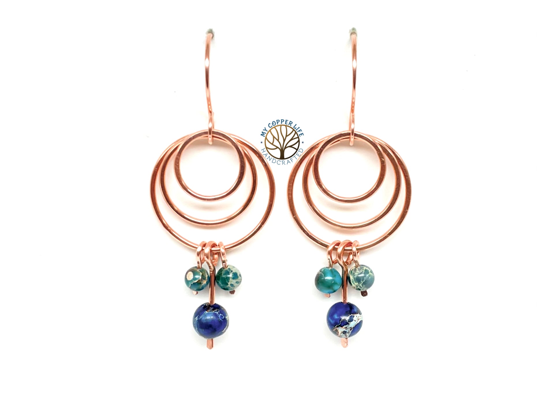 Copper wire concentric rings earrings with imperial blue Jasper beads. Ear wire handcrafted to match.