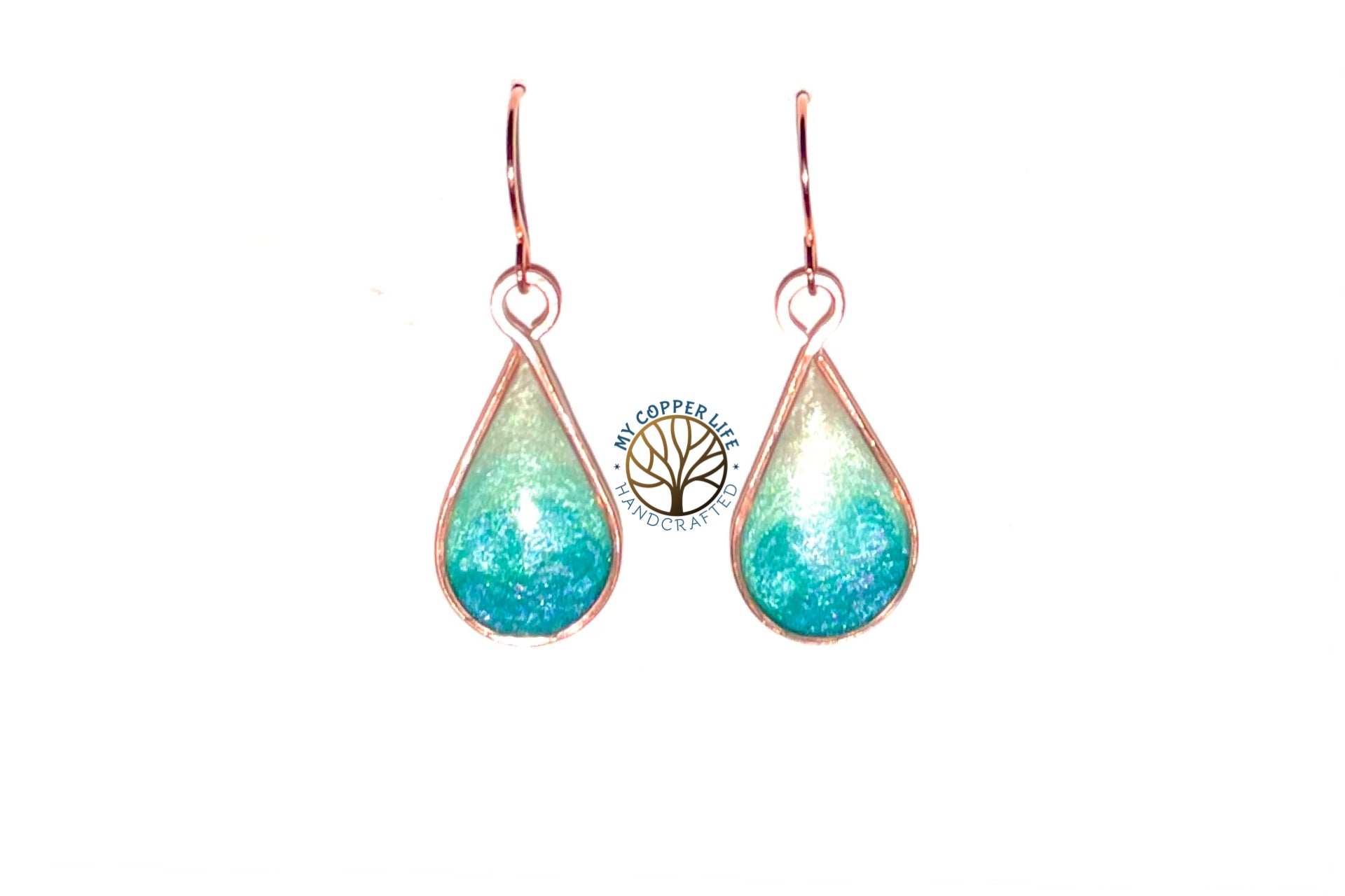 Handcrafted copper teardrop bezel filled with resin. Comes on handcrafted copper ear wires.