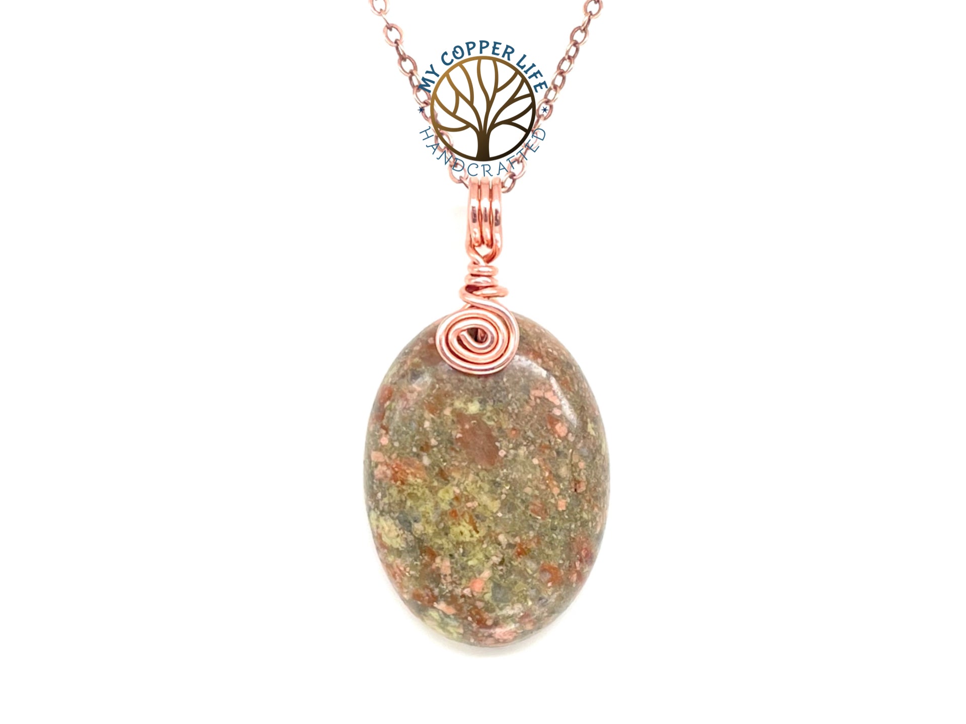Handcrafted copper wire bail and unknown beautiful polished and flat backed stone pendant. The stone measures 35mmX25mm. Comes with an 18” copper chain.