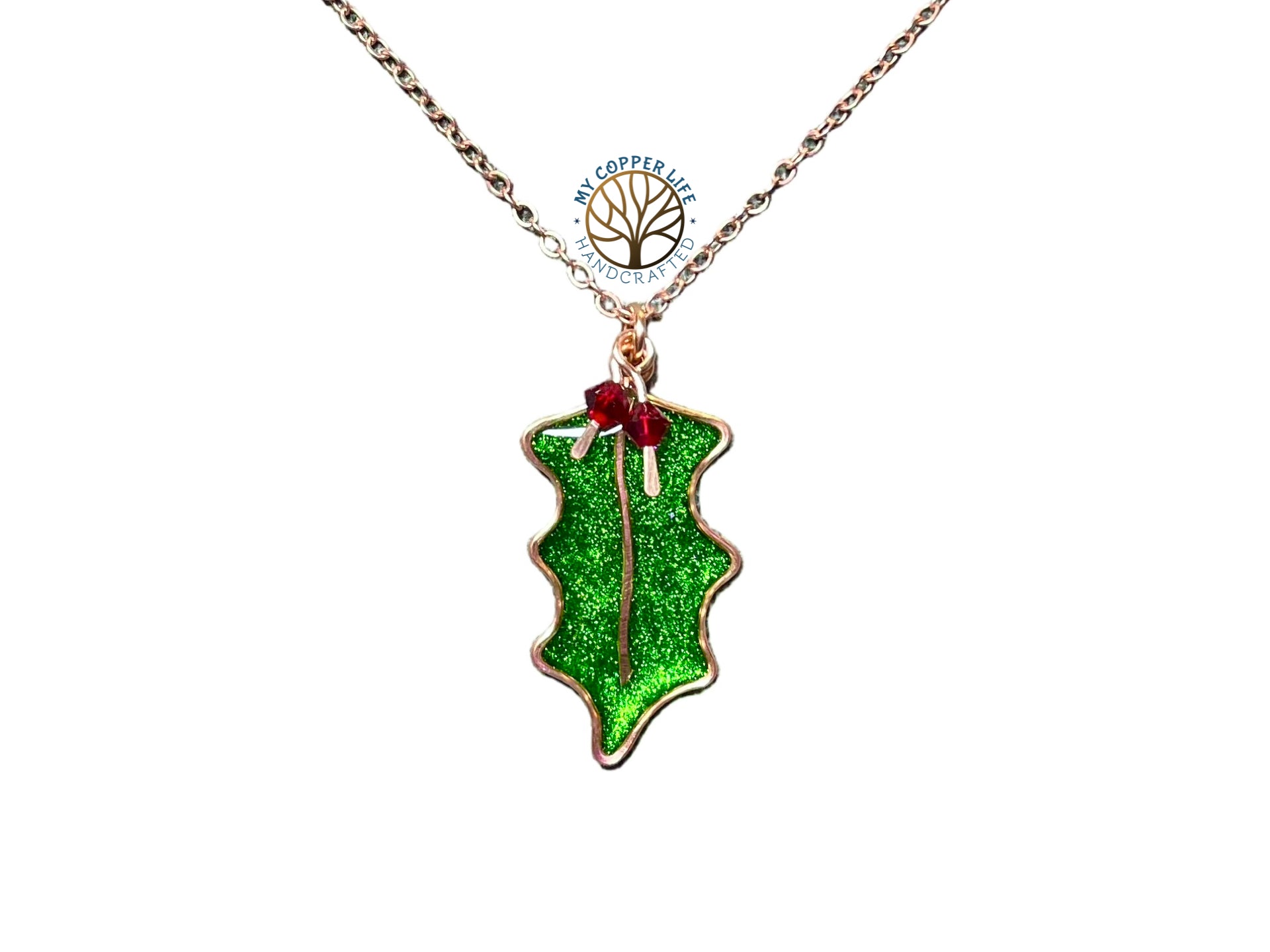 Holly and resin holly pendant. Comes on a 20” bare copper chain.