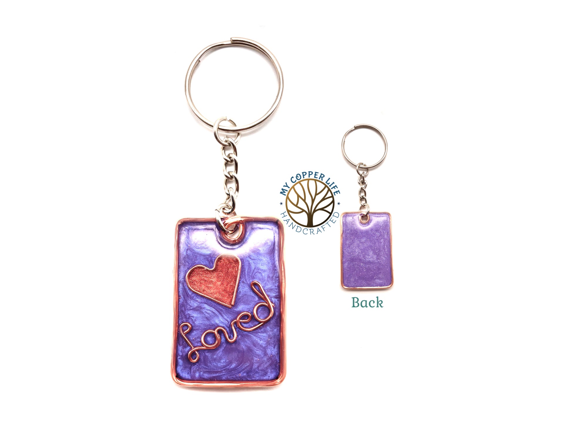 These Keychains are made with a 12 gauge copper wire bezel, 20 gauge copper wire heart and the word “Loved” and layered with one layer of colored UV resin and then layered with multiple coats of Clear UV Resin.